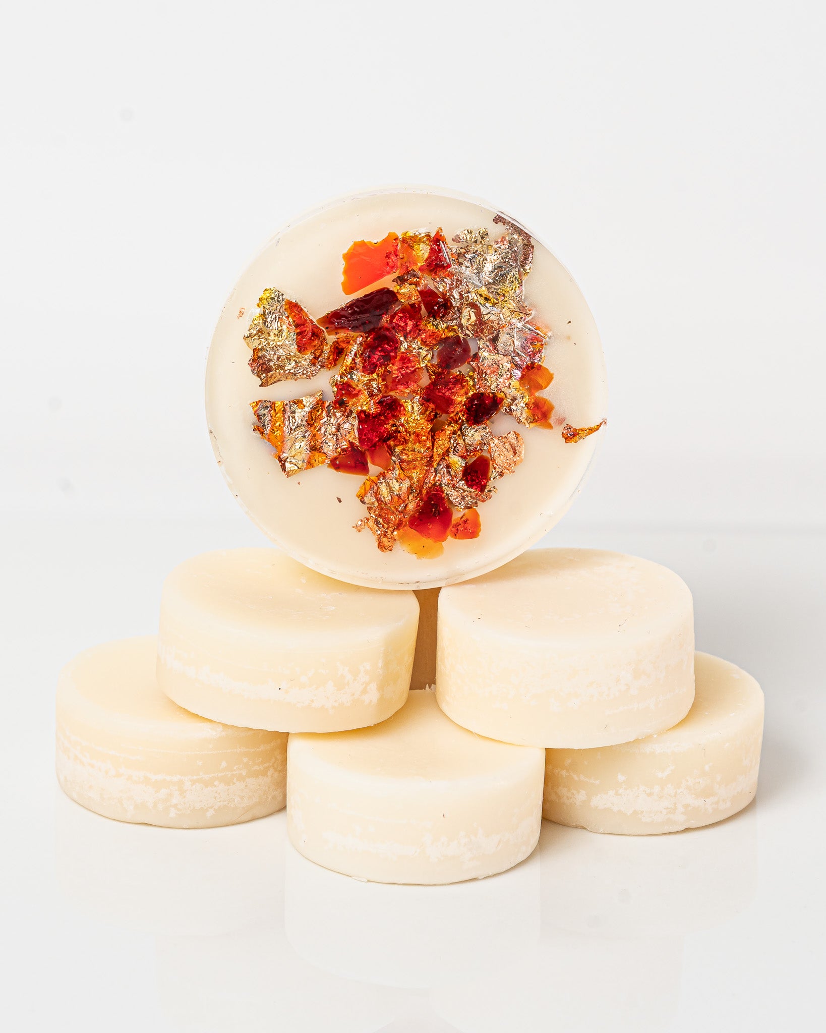 Elevate your à la carte order by adding a 2 oz decorative wax melt, elegantly accented with crushed red and orange glass and gold/copper leaf, for just $2!