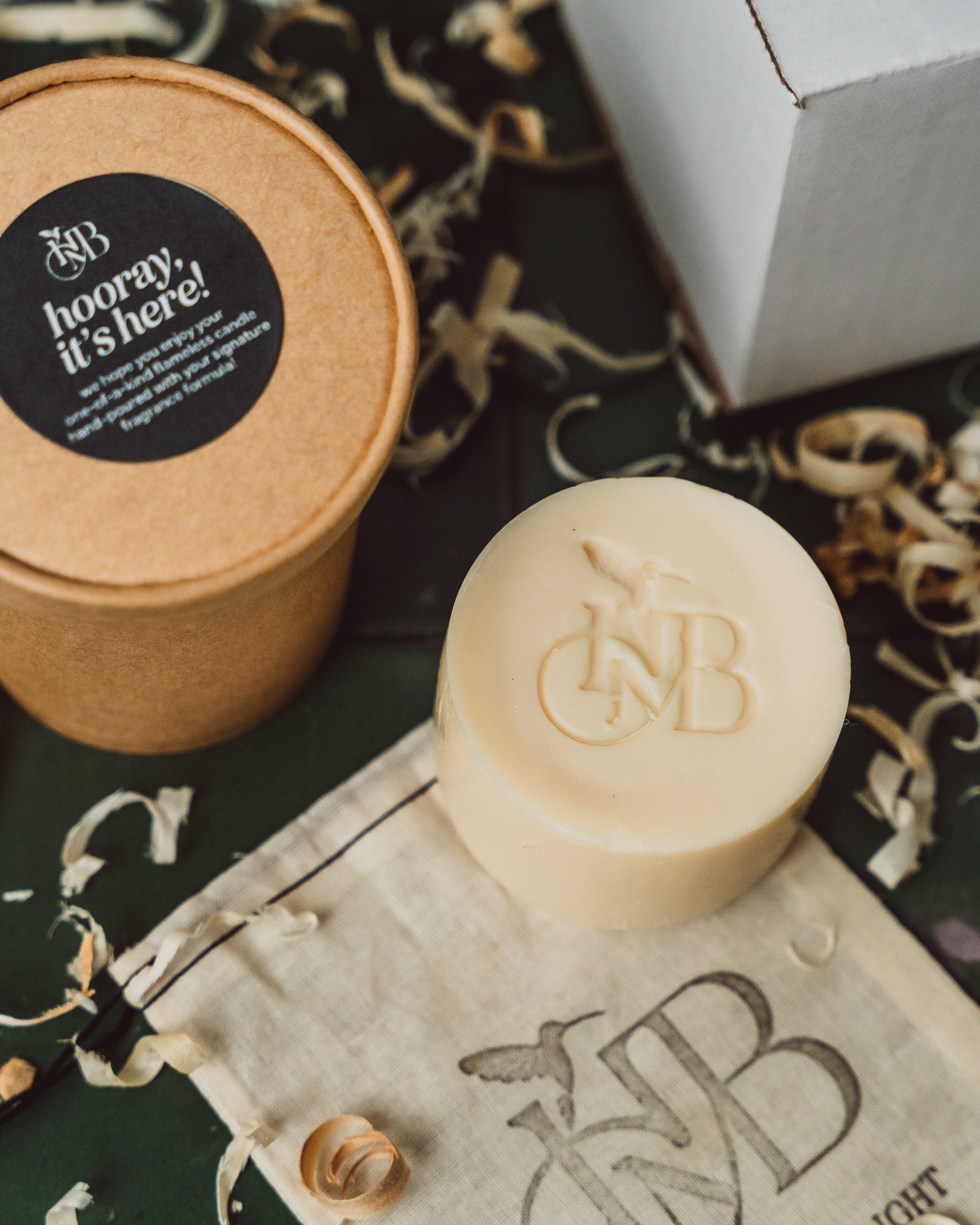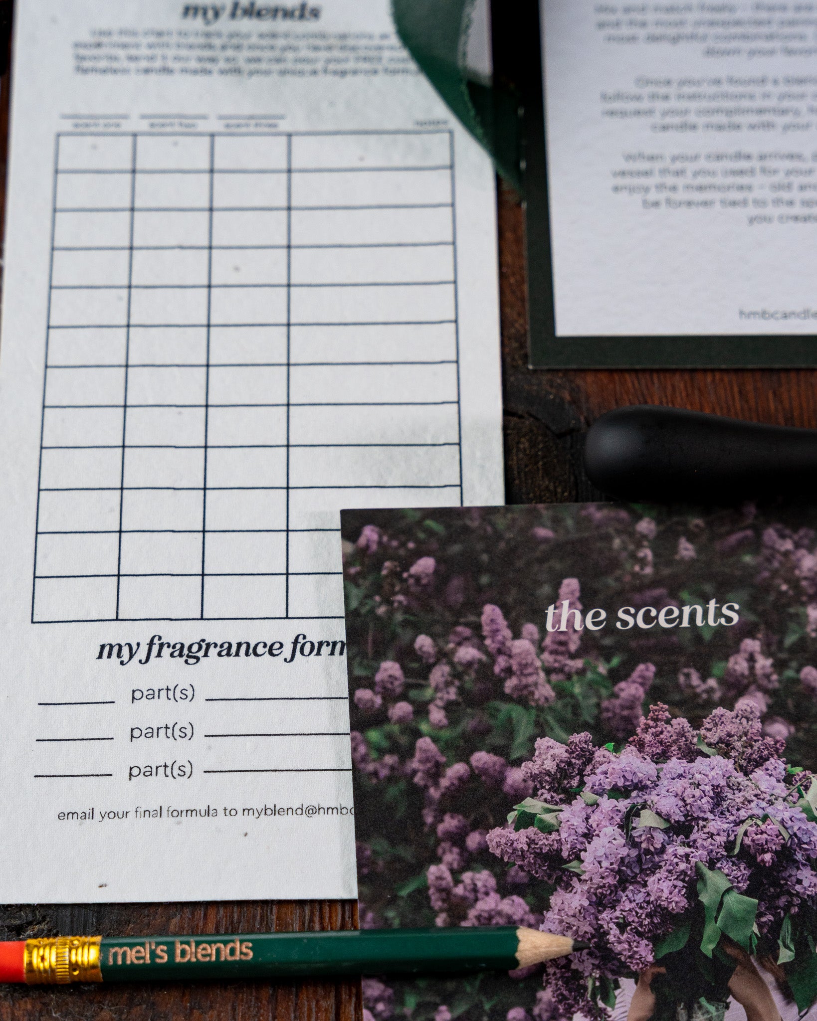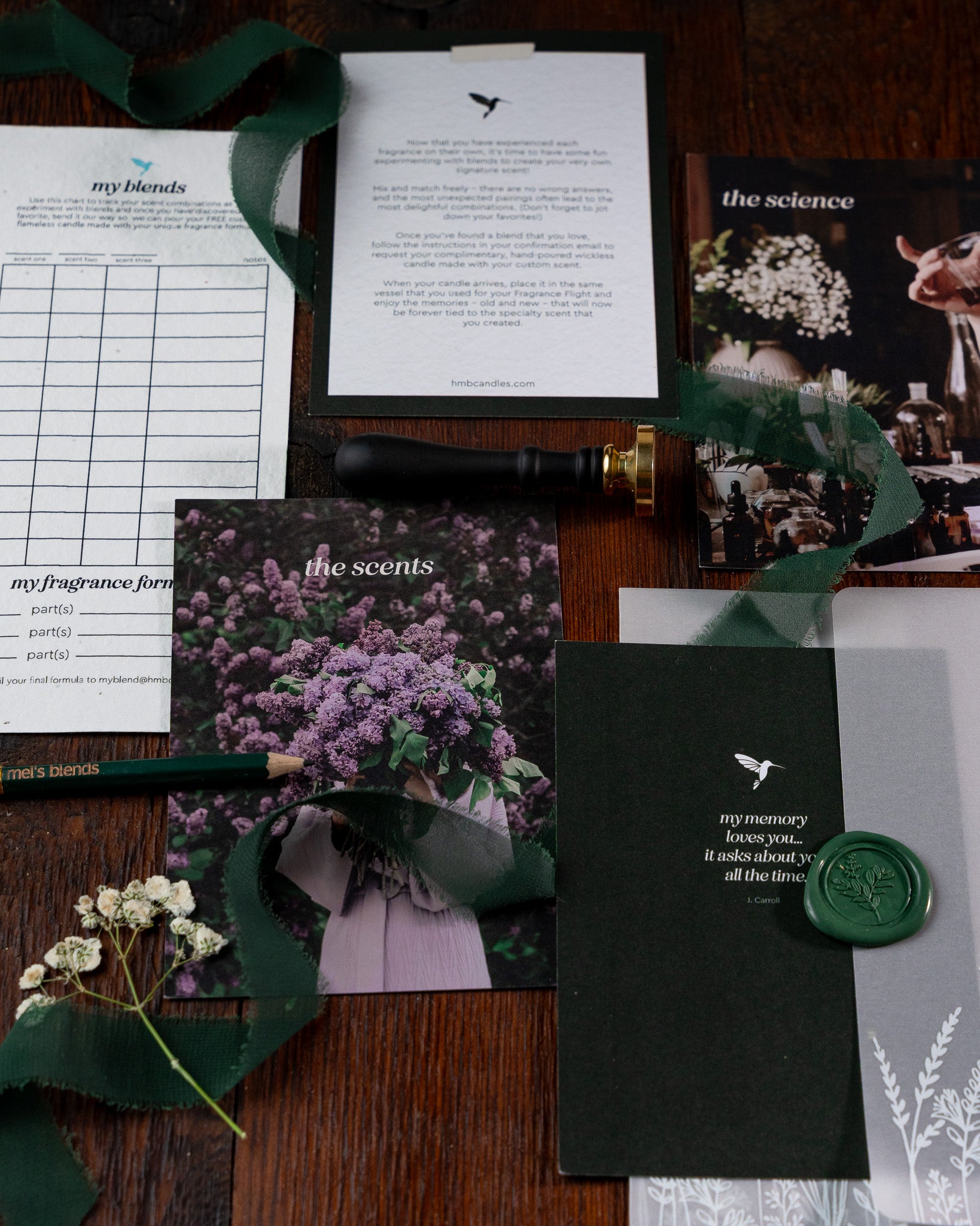 • One custom flameless candle poured with your signature fragrance formula (shipped separately)