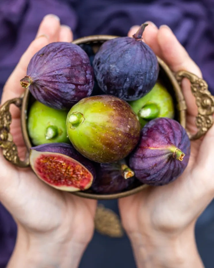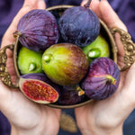 Lush, sun-ripened figs with a hint of fresh greenery.