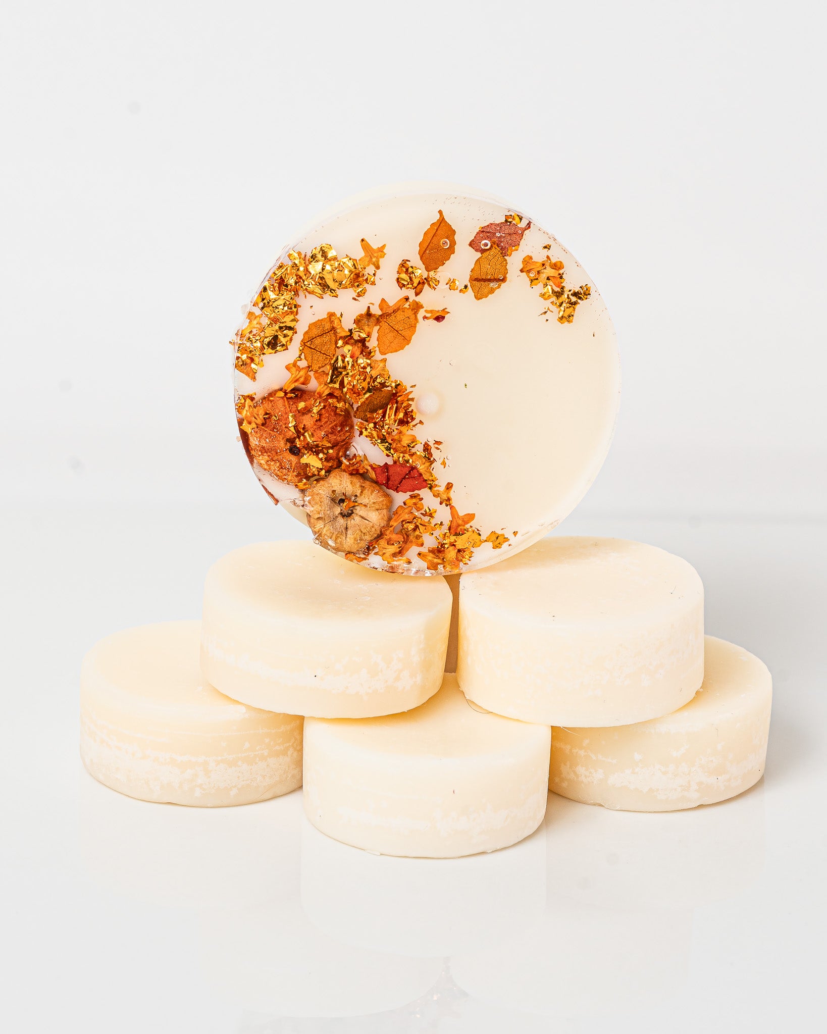 Elevate your à la carte order by adding a 2 oz decorative wax melt, elegantly accented with dried mini pumpkin pods, real fall leaves and gold/copper leaf, for just $2!
