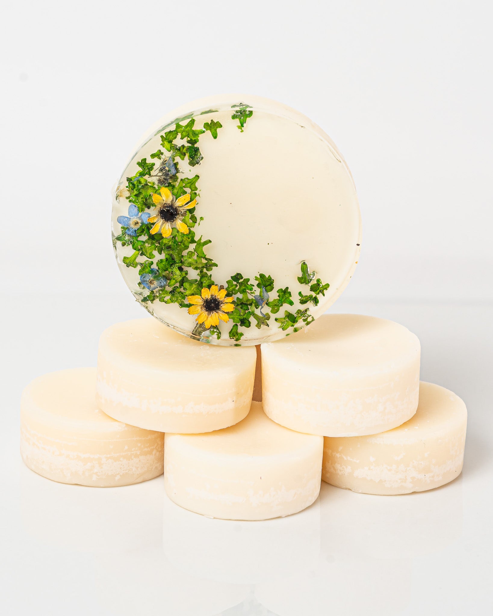 Elevate your à la carte order by adding a 2 oz decorative wax melt, elegantly accented with crushed green leaves, mini sunflowers and beautiful forget-me-nots found in nature, for just $2!